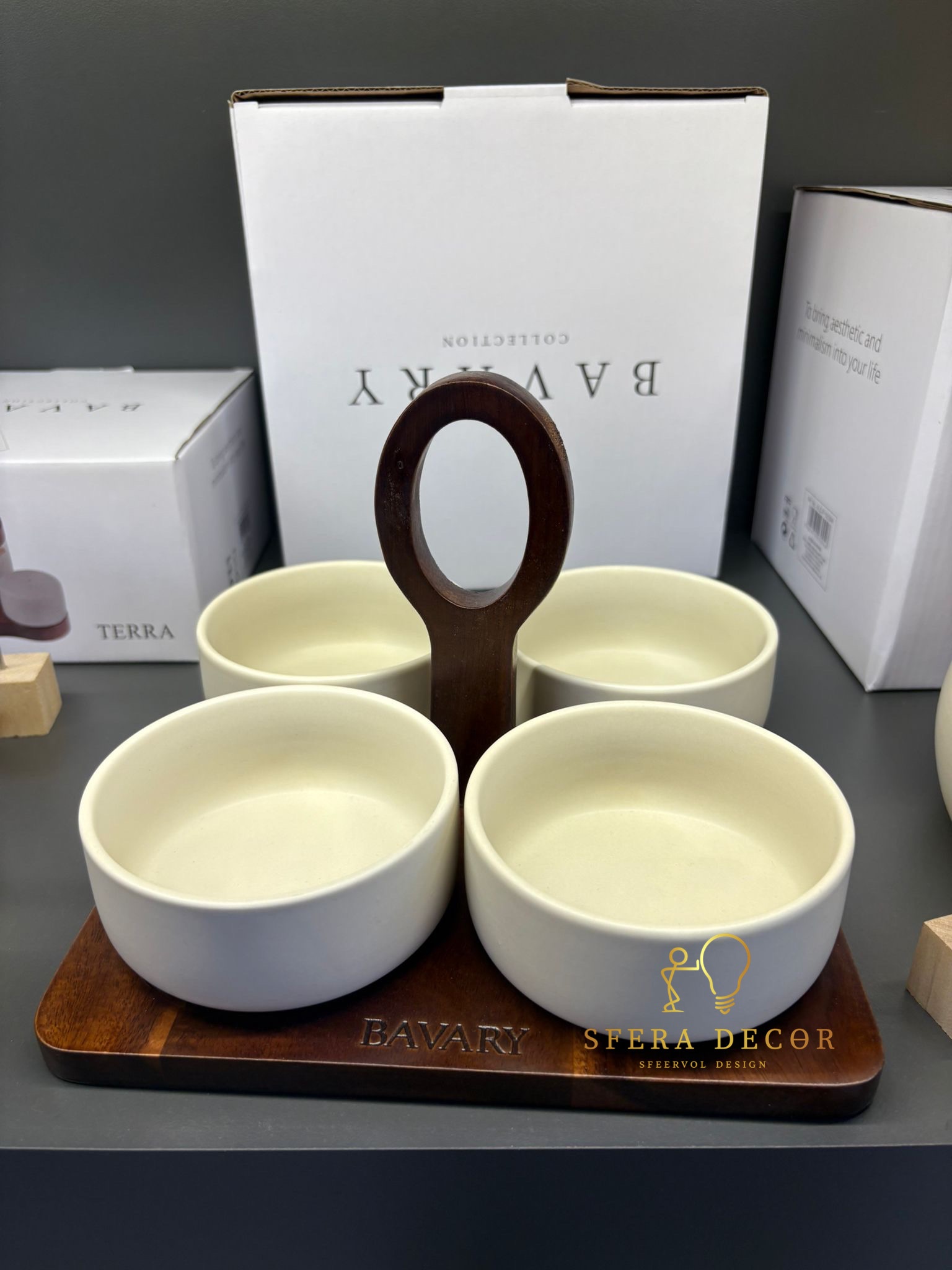 Luxe serveerset met vier porseleinen kommetjes op een stevige acaciahouten tray ideaal voor dips sauzen tapas nootjes olijven en kleine snacks past bij de luxe tafelcollectie van SferaDecor
